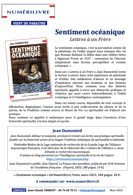J’ai la grande joie de vous annoncer la parution de mon livre Sentiment océanique. Lettres à un Frère qui prolonge et développe le propos dont je vous entretiens régulièrement sur ce blog.